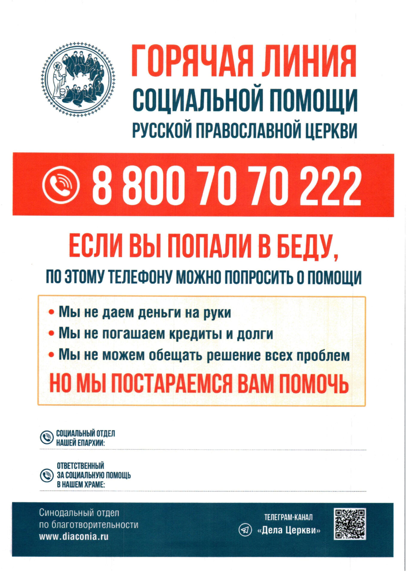 Если вы (или ваши близкие) оказались в трудной жизненной ситуации, знайте: у Русской Православной Церкви есть Горячая линия социальной помощи.